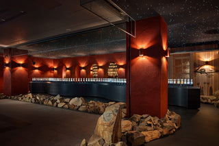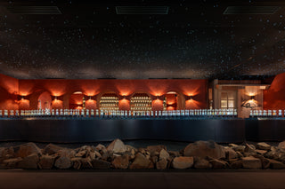 天井には、1833年3月、ティエラ・デル・フエゴの空に広がっていた星々の配置が忠実に再現されています。星空専門のエンジニアにより、一本一本の光ファイバーを手作業で配したこの天体図は、空間に静寂と崇高な体験をもたらします。視界が開けるほどに、星々は穏やかに、そして確かに瞬き始めるのです。これは、FUEGUIA 1833という名の由来ともなる物語——探検家に連れ去られた先住民の少女フエギア・バスケットが、チャールズ・ダーウィンの手により故郷パタゴニアへと帰還した夜の星空が、現代の日本の技術によって空間の中に再構築されたものです。