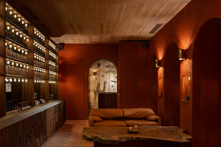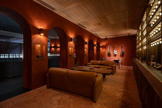 空間の設計を手がけたのは、創業者ジュリアン・ベデル。南米と日本という異なる文化に根ざす建築的要素を独自に融合させ、FUEGUIA1833ならではの世界観を体現しました。使用されている素材は、京都の土や火山灰、テラコッタなど、自然が育んだものばかり。南米と日本、両方の文化において古くから用いられてきた土壁は、呼吸するような温かさと静けさを空間にもたらします。