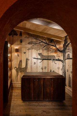 奥へと進むと、もうひとつの特別な空間が広がります。そこには、画家・イラストレーターである山口洋佑氏による墨のミューラルアートが施されています。Vicuña、Hornero、Yaguaretéといった製品に込められた物語を象徴する動物たちが、まるで家主の手によって描かれたかのように静かに佇んでいます。日本製の墨汁と筆を用い、杉板に描くことで、墨が木目に寄り添い、唯一無二の温もりと深みのある風合いが生まれました。素材とモチーフが呼応する、詩的で静謐なアートピースです。
